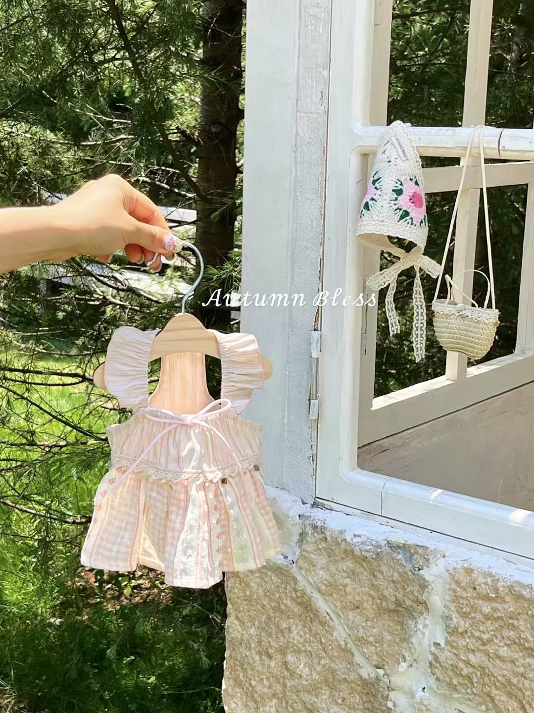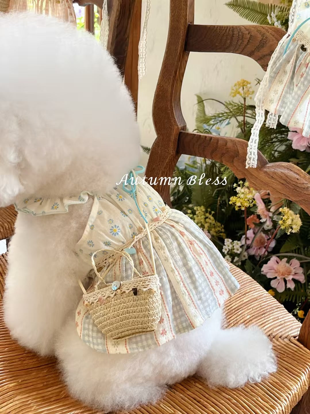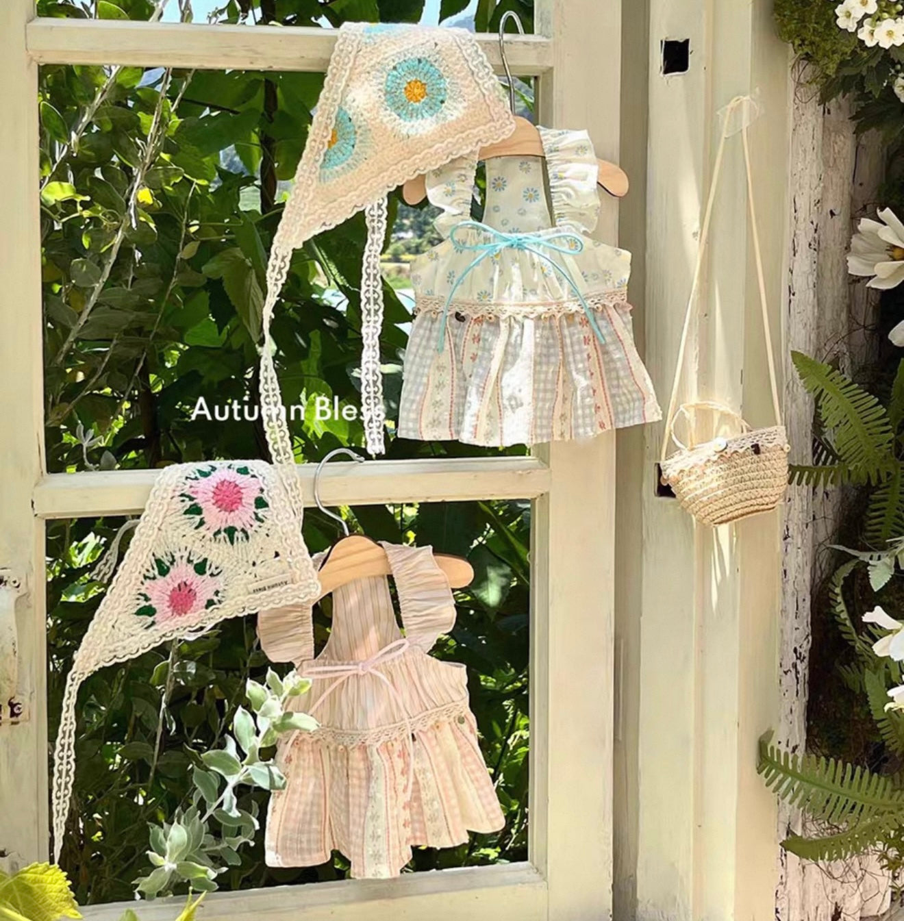 Lightweight and breathable material. Shirring for easy on and off. Floral embroidery and lace detailing. Headscarf included or sold separately. Grass-woven bag sold separately (click here).