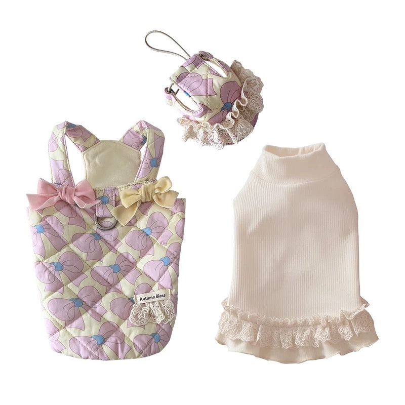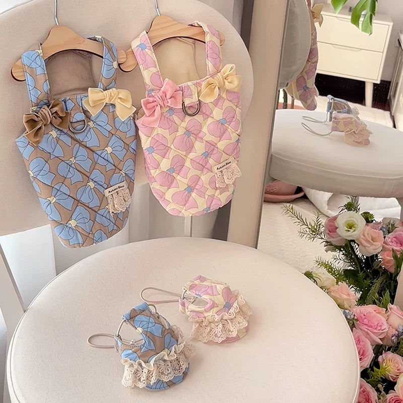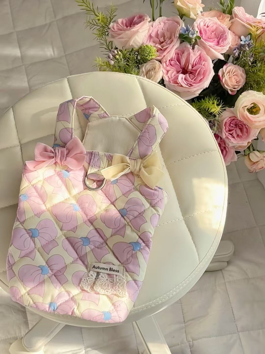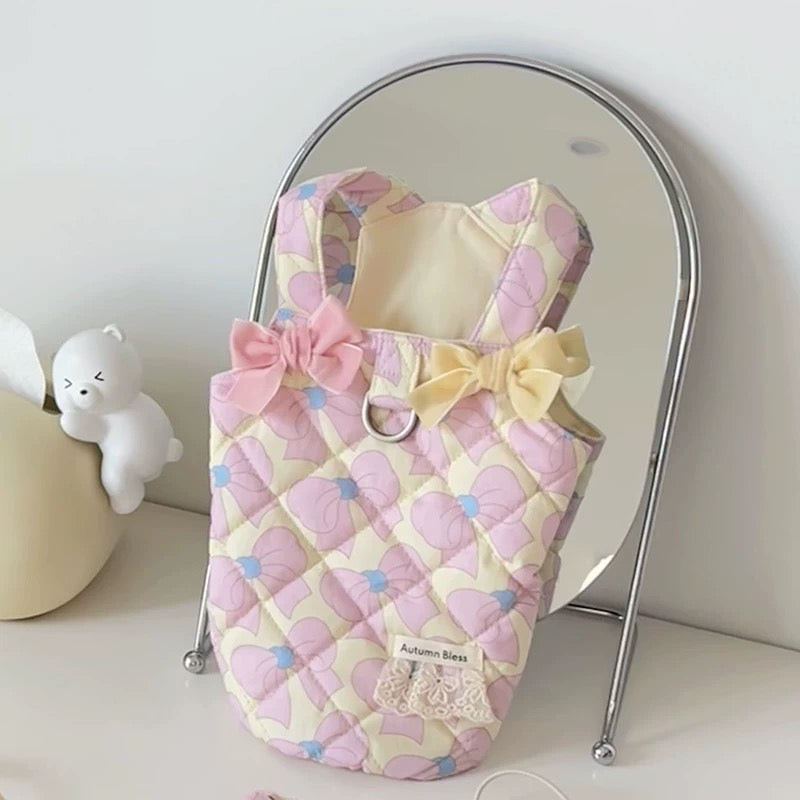 A stylish sleeveless cotton vest featuring an all-over bow print, perfect for early spring. Designed with a D-ring , making it convenient for attaching a leash. Soft, breathable, and comfortable for seasonal transitions.
