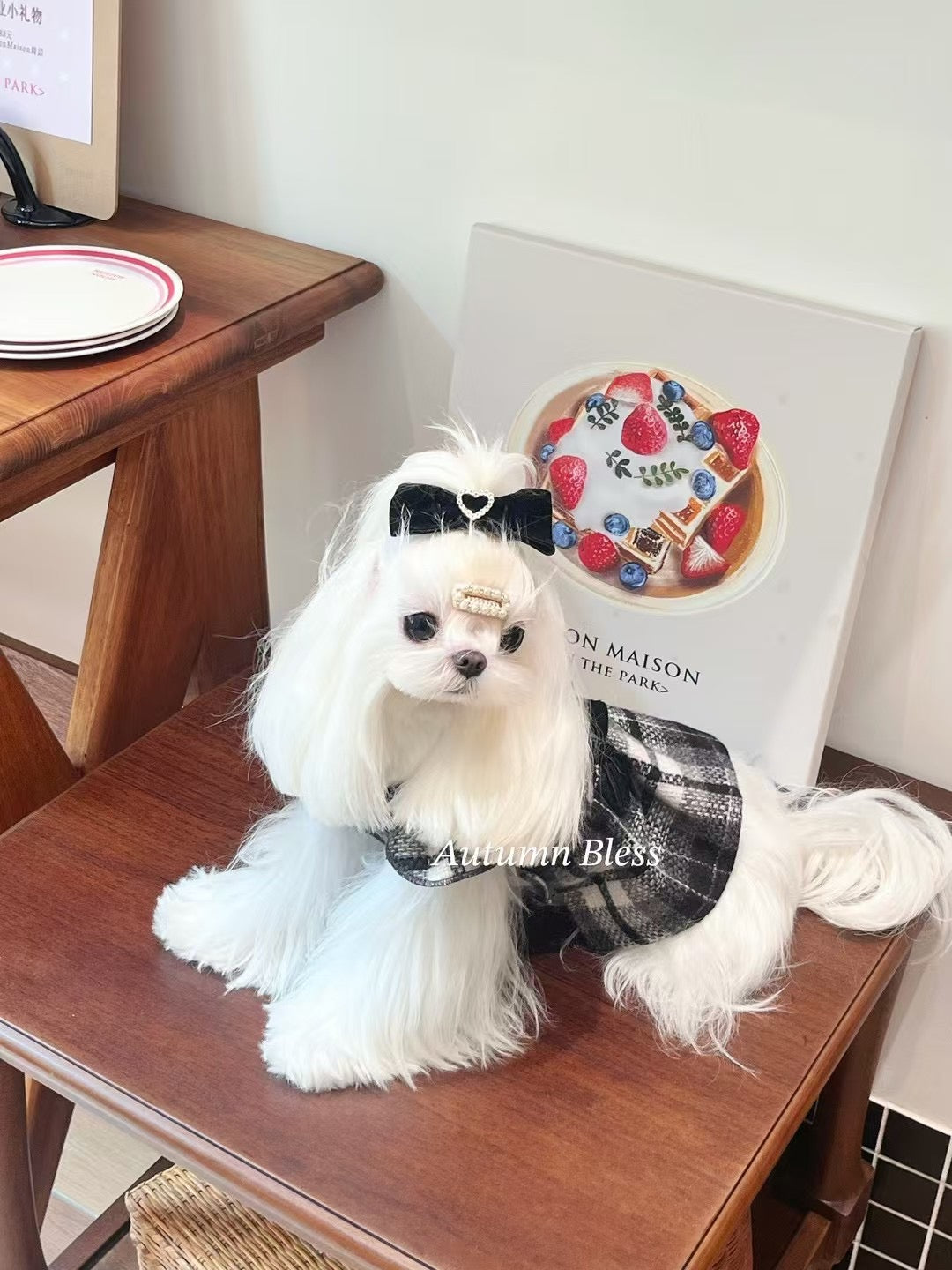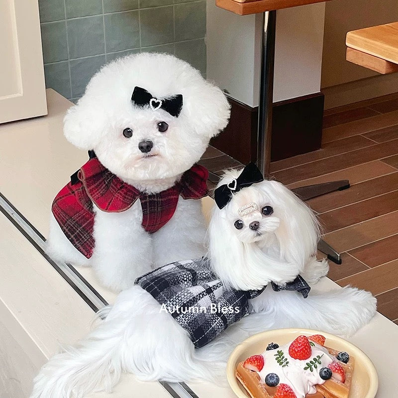 Festive Check Ruffle Dress <br>Complete your dog's holiday look! Featuring a classic check pattern, delicate ruffles, and elegant velvet ribbon, this dress is perfect for Christmas gatherings, photo shoots, and winter events. What's more, this dress comes with a cute ribbon-shaped hair clip! (Hair clips sold separately) The XS and S sizes feature a small waist ribbon, while the M to XL sizes feature a large, eye-catching waist ribbon. Pairing it with a hair clip will make your dog's holiday style even more attractive.