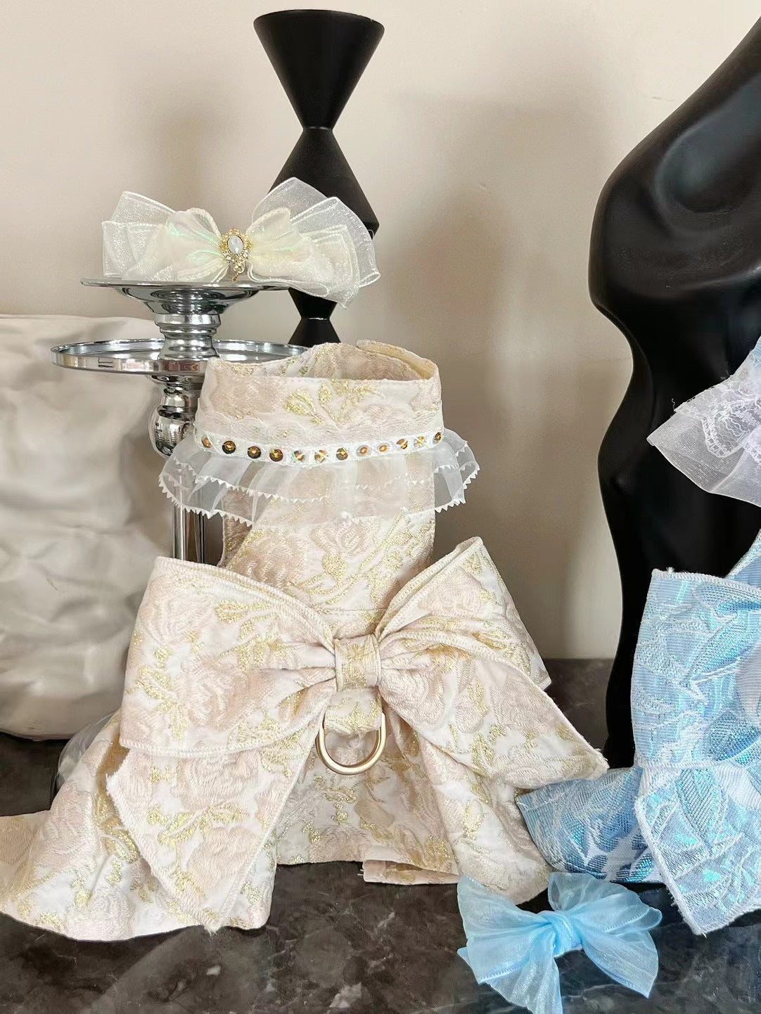 This beautiful harness set features a large, elegant bow and a floral design, perfect for small dogs. Comes with a matching ribbon for stylish and cute.