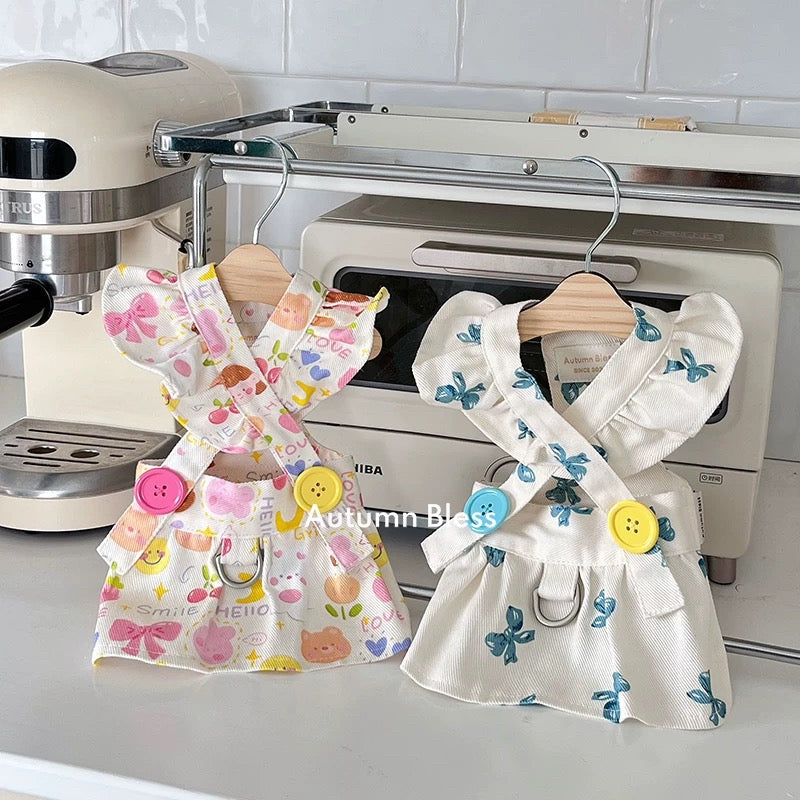 This adorable floral dress for small dogs features a ruffled design and a built-in harness attachment for convenient walks. The bright buttons add a playful touch, making it perfect for both style and function.